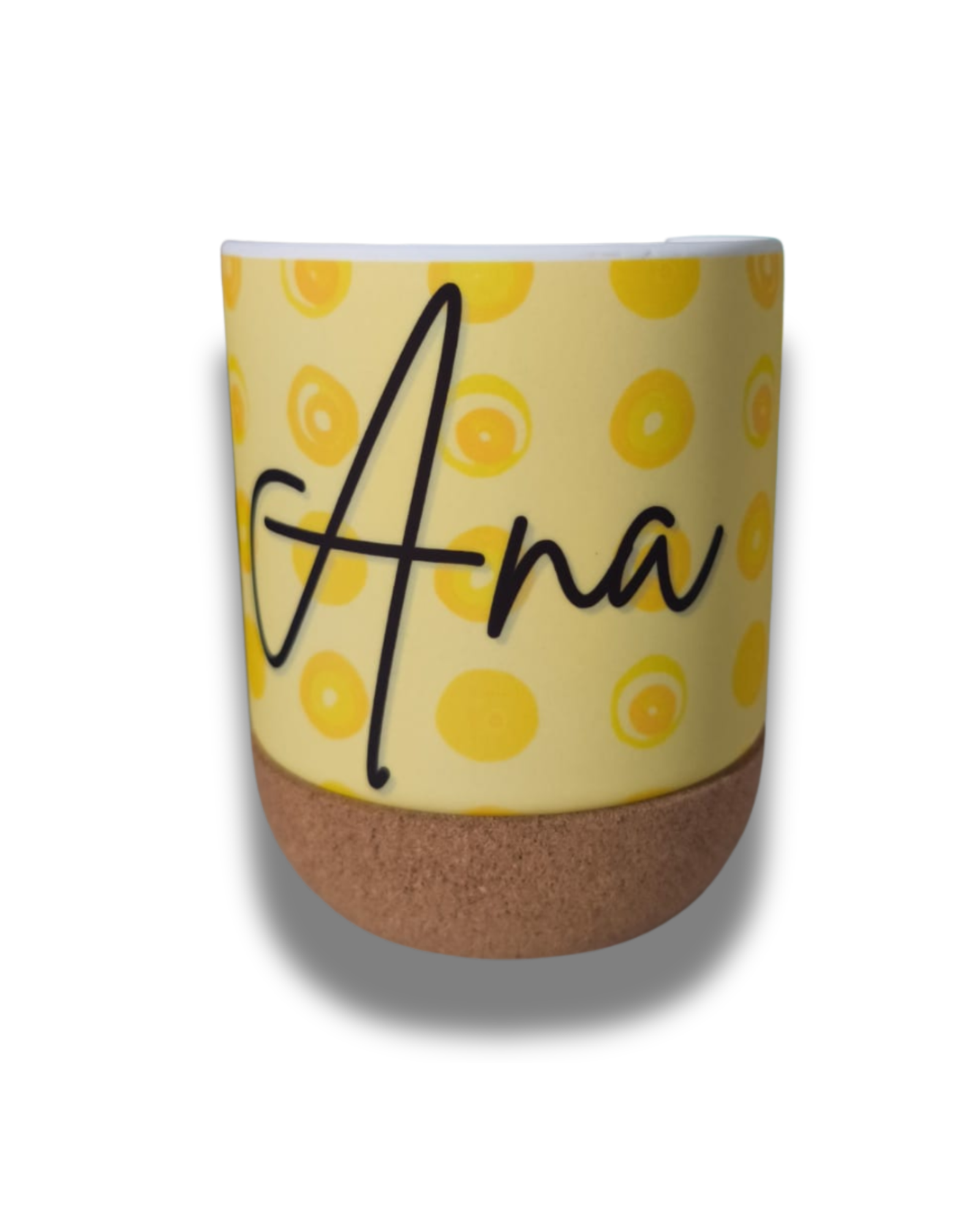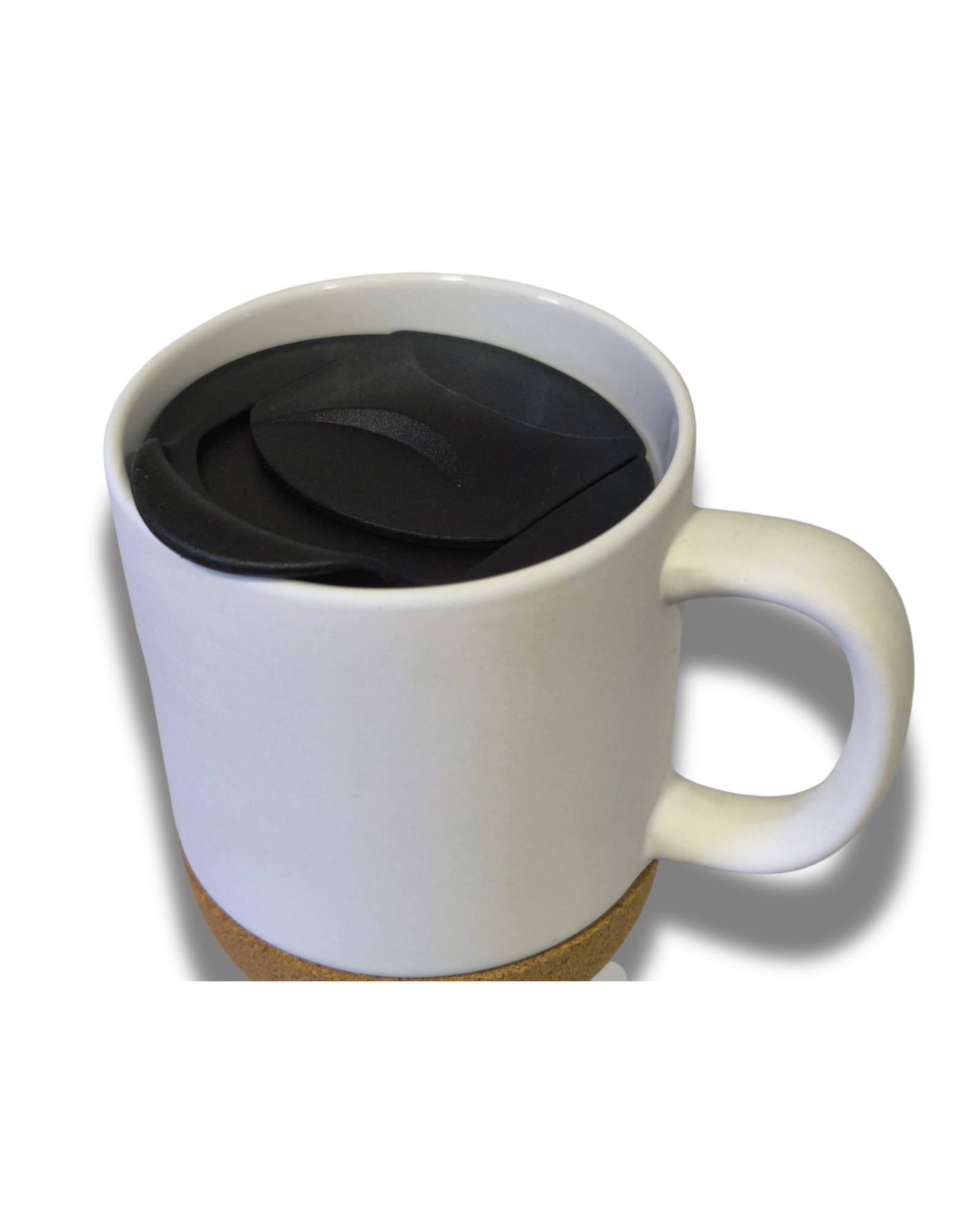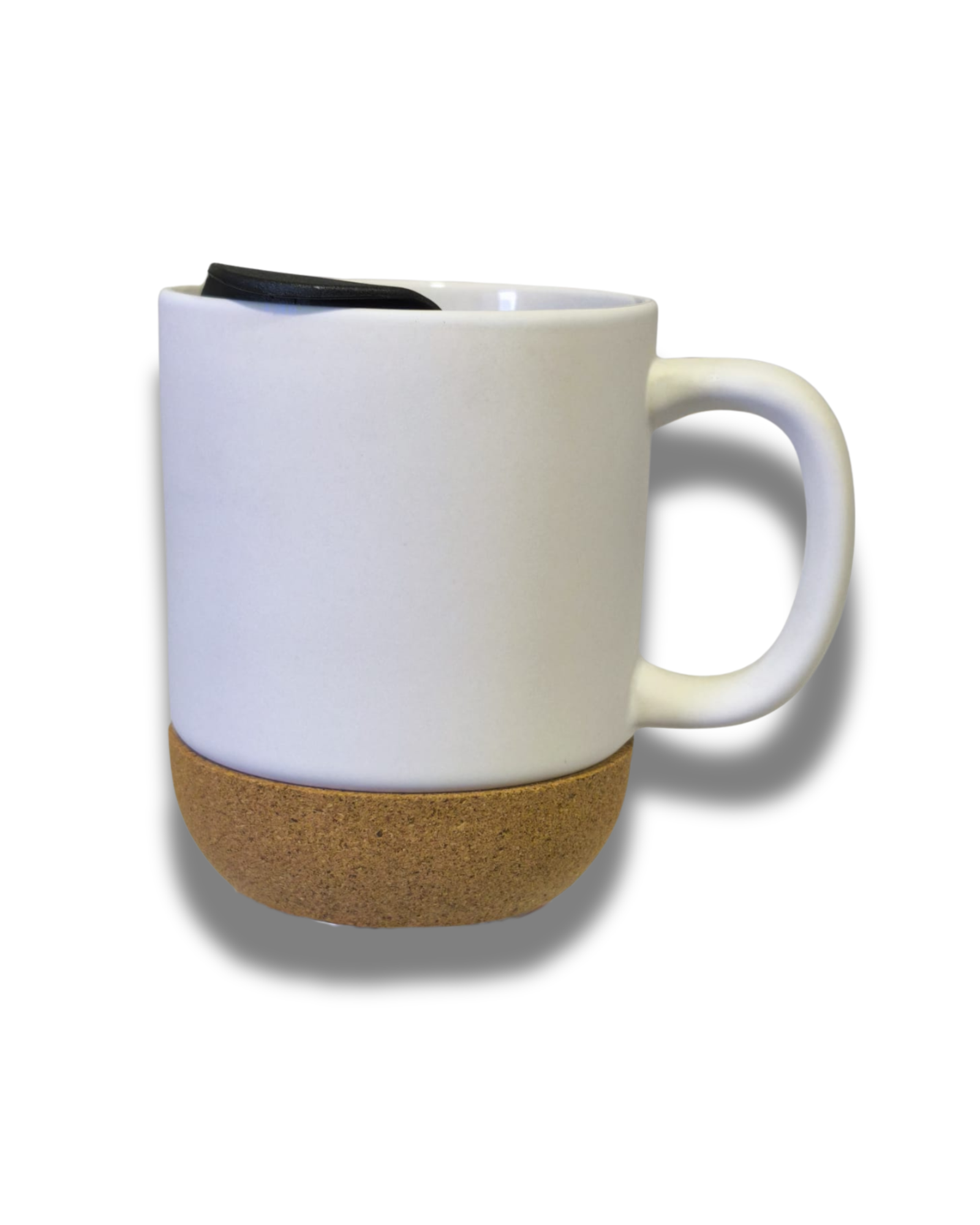 Taza de cerámica de acabado mate y diseño moderno, equipada con base de corcho natural que actúa como aislante térmico y protector de superficies. Su forma cómoda y estable la hace ideal para el uso diario tanto en casa como en la oficina.